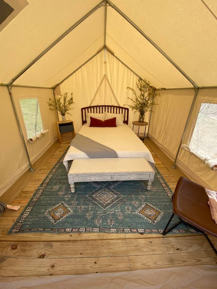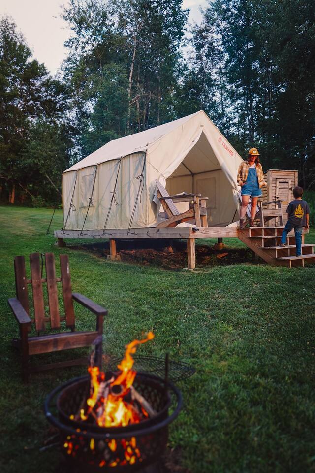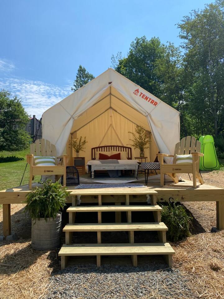 Venture to the endless mountains and relax in your own cozy glamping tent. Experience the perfect blend of nature and comfort—just bring your food and drinks. We provide a queen-size bed with soft sheets and warm blankets for a restful night’s sleep. Step outside your tent to unwind on your deck and take in some of the best sunset views in NEPA. HIGHLIGHTS ✓ Cozy space for two ✓ Stargazing, and (communal/shared) hot tub, outdoor kitchenette, fire pit ✓ Trails, views & outdoor peace